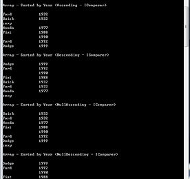IComparable 및 IComparer 인터페이스 Visual C#에서 사용 하는 방법refer: http://support.microsoft.com/kb/320727/ko static void Main(string[] args) { // Create an arary of car objects. car[] arrayOfCars = new car[8] { new car("Ford",1992), new car("Fiat",1988), new car("Buick",1932), new car("Ford",1932), new car("Dodge",1999), new car(string.Empty,1990 ), new car("sexy",null ), new car("Honda",1977) }; // Write..